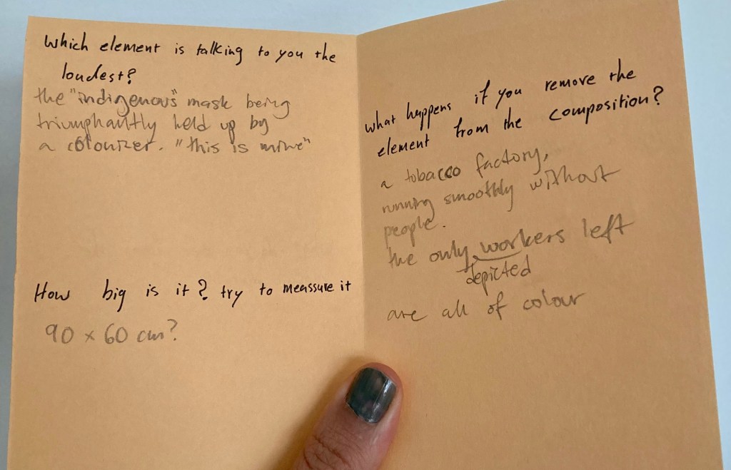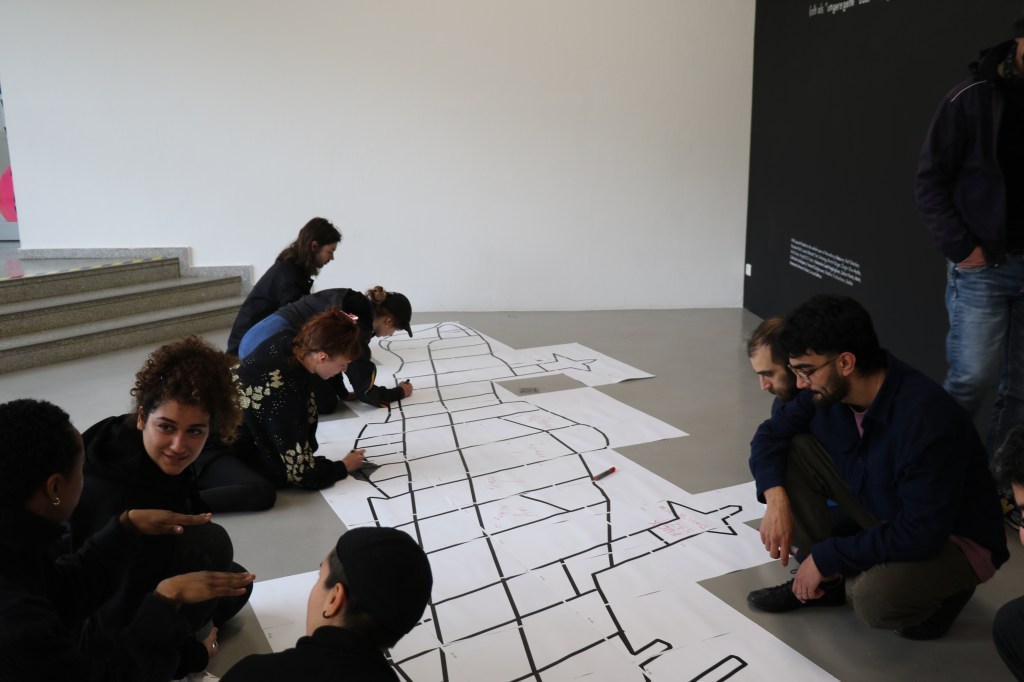 during the walk, the group was divided into pairs, in which one person remains their eyes closed but is allowed to speak to describe the soundscape they are exposed to whereas the other person who is guiding them should refrain from speaking. The participants are encouraged to practice trust and activate their senses on the way to the central station where they are given a score and pencil to spend time with the mural around questions pertaining to the recognition of the violence in the image and imagining the otherwise.
