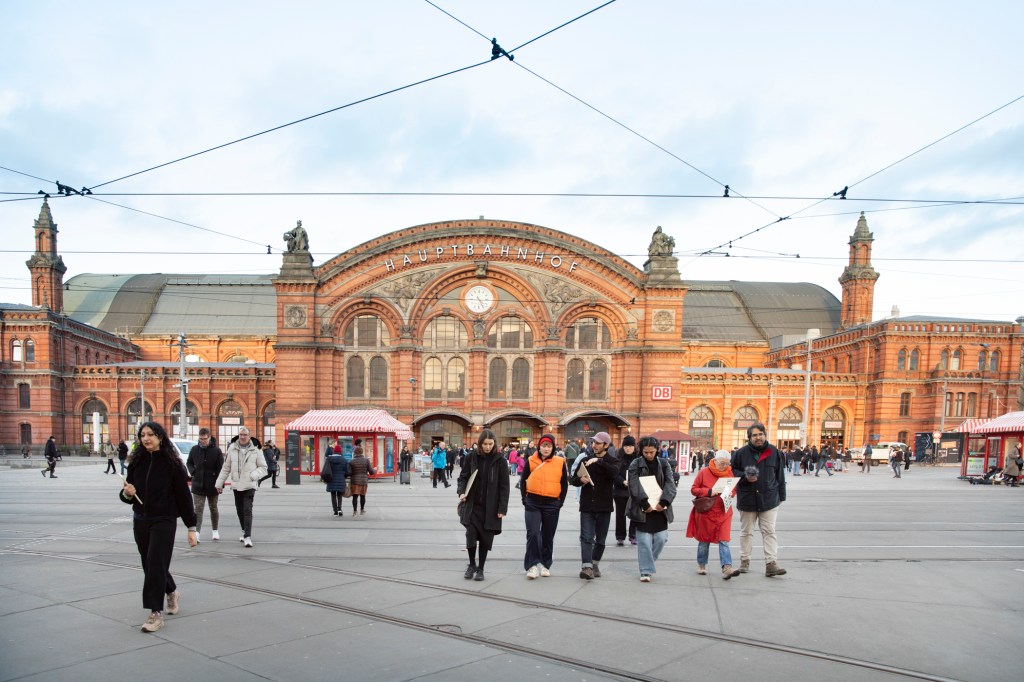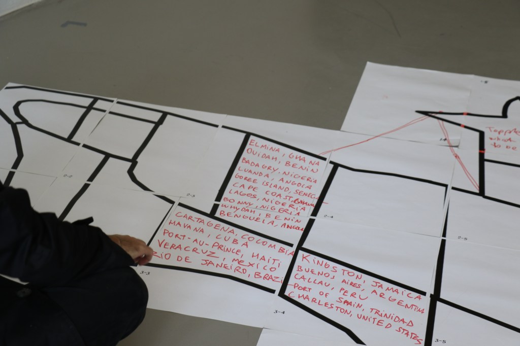 The second day of the workshop the ‘Beyond Undoing a Rediscovery’ was comprised of a city walk, group reading, and the second collective intervention in the Mosaic mural imagery at Bremen central station that was rediscovered in the 2002 renovation project and kept exposed ever since. The workshop which was hosted by the Circa106 project space within the Common_S Knowledge_S residency program picks up on the first intervention that took place as part of Lacuna: inside a Dumpling activation program in Weserburg Museum on the 7th of May and tends to reflect upon and correspond to the entanglement of colonial trade and the 1492 “voyages of discovery” both constitutive of an epistemic ground that perpetuates colonial role allocation that is imbued in today’s Bremen cityscape.