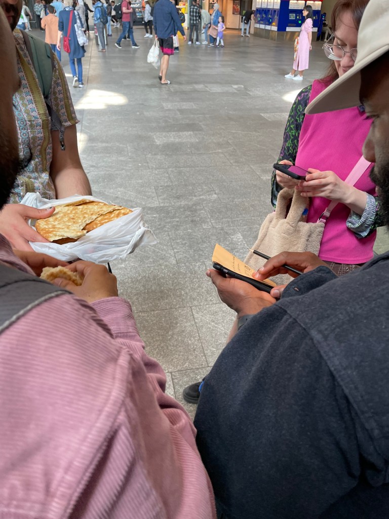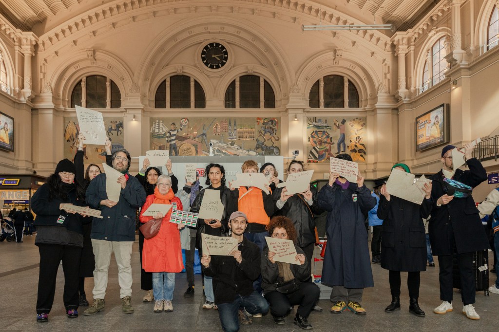 The artist looks at the colonial/racist imagery that is embedded in the mosaic mural at the central station Bremen. In May 2023, Farajnezhad began hosting workshops and discussions about the theme. These events encouraged people to over-write the image of the ship in the mural, which uncritically celebrates Bremen’s “innocent” overseas trade, a trade that greatly benefited from transatlantic slavery and colonialism. (photos taken by Sara Foester)