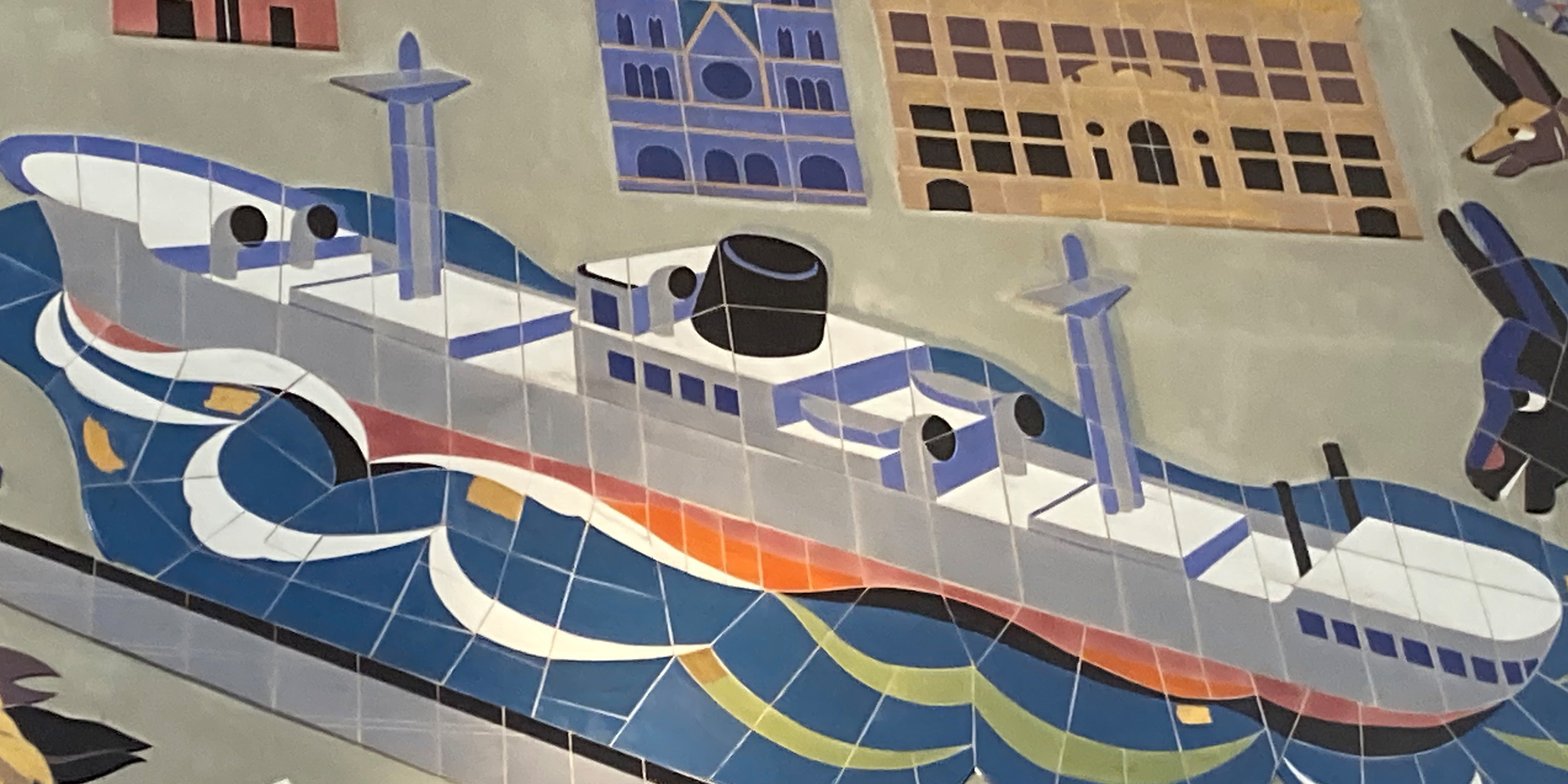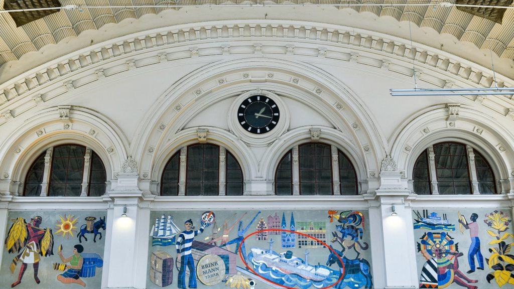 A project series that critically explores the colonial and racist imagery within the mural at Bremen’s central station (Brinkmann Mosaik) by fragmenting and over-writing the image of the transatlantic ship, situating it in dialogue with diverse local contexts and interconnected causes.