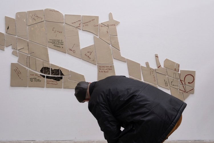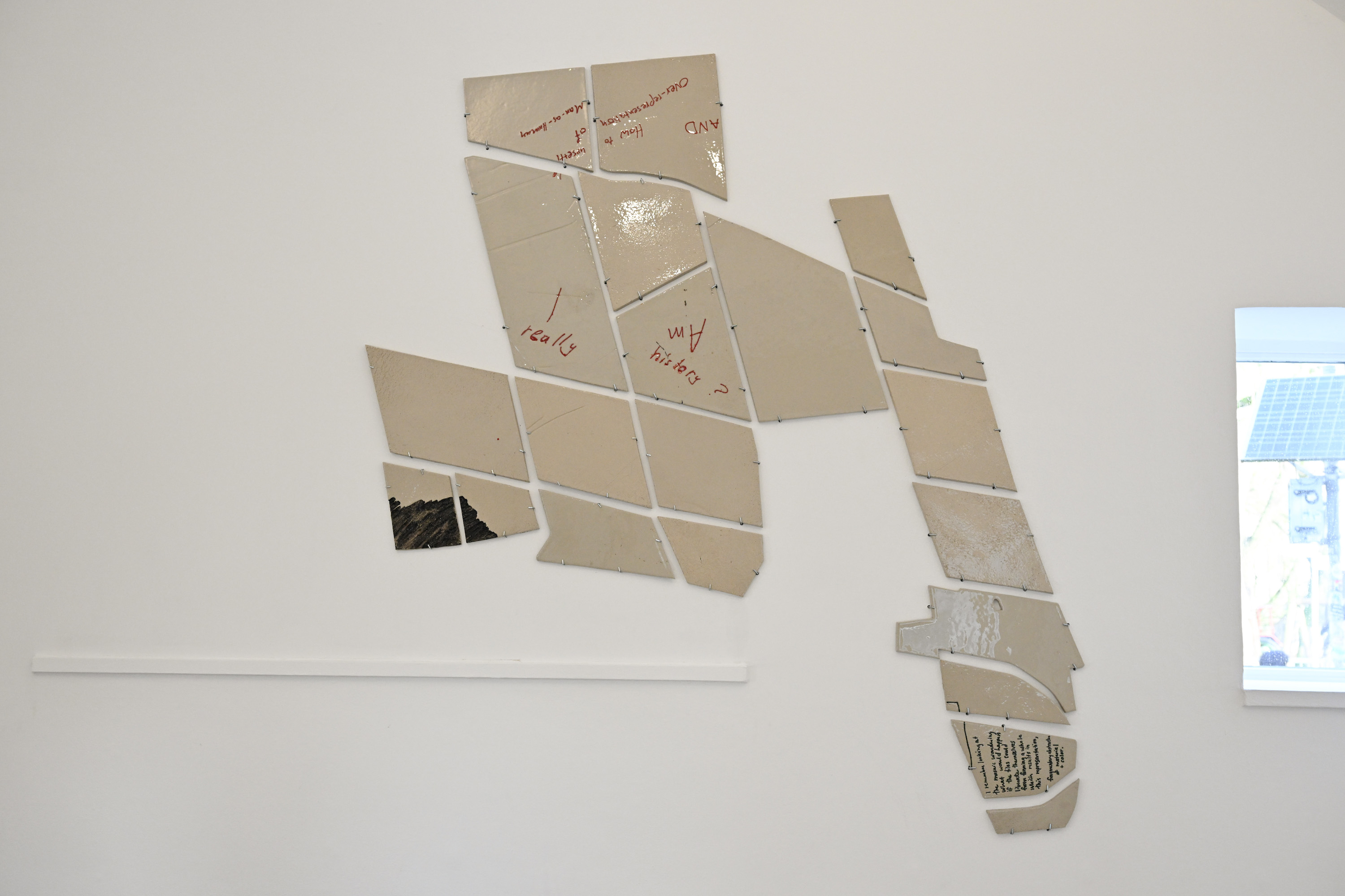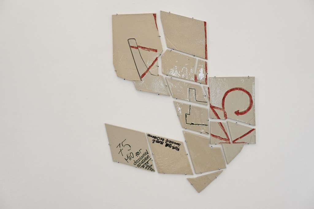 In the Pavilion of the Gerhard-Marcks-Haus, Aria Farajnezhad responds artistically to the colonial mosaic mural at Bremen’s main railway station. He confronts viewers with a collection of overwritten ceramic mosaics and audio recordings of conversations with Hodan-Ali Farah, Fatou Sillah, Abdur Rehman Zafar, Anna Blahaut and Minna Henriksson that critically discuss Bremen’s role in colonialism. Structural racism and global inequality are also taken up as themes. The project was launched in May 2023 under the title “Beyond Undoing a Rediscovery”. Now, following stints at the GAK, the Städtische Galerie Bremen and Horner Eck, the series is continued at the Gerhard-Marcks-Haus from December 2024 until February 2025.