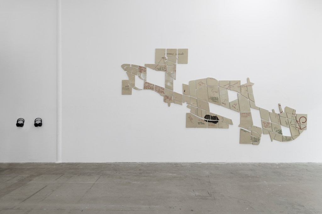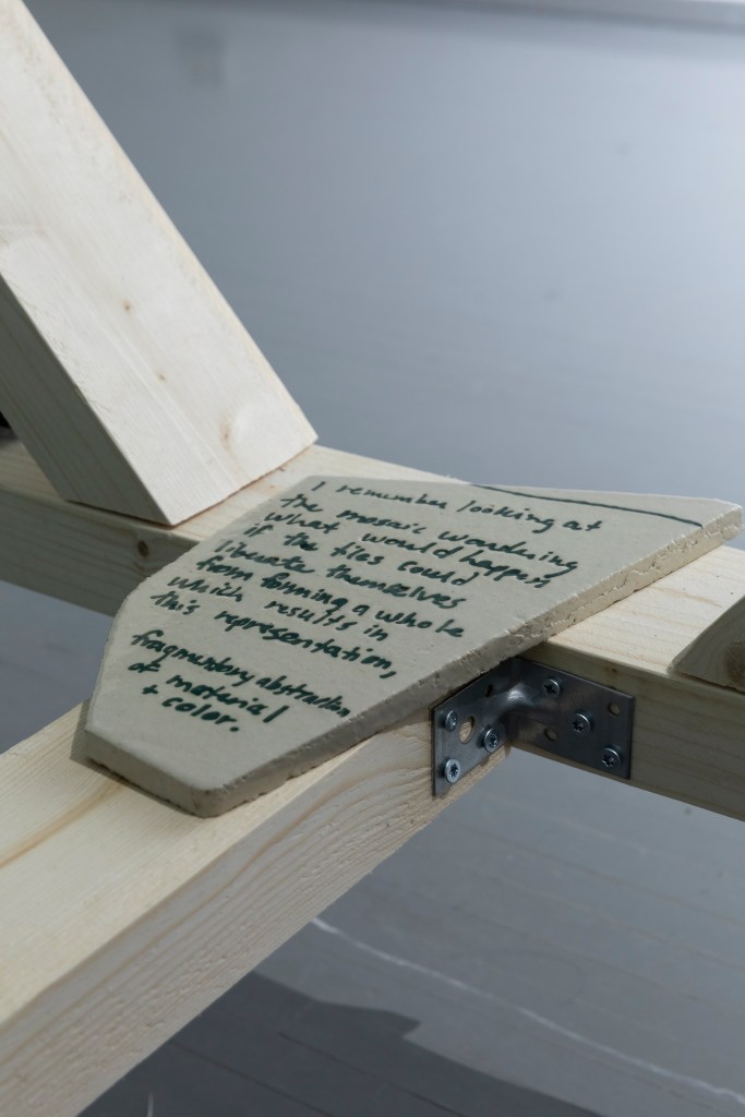 The Shadow of the image of the ship drawn from the mosaic mural in the central station Bremen is casted upon the the replica of the ship stand as if the structure is holding it. The installation is inspired by the practice of scrapping deployed in the dry dock to take the ships apart in order to repurpose the used material, yet the fragmentation in this work happens through the counter-archival method that Farajnezhad deploys through meeting, carrying the mosaics and recording conversations with local artists and researchers engaging with questions that mosaic poses. The over-writing of the image of the ship happened collectively as part of the workshop in May 2023 on paper and later transferred to mosaics together with Eghbal Joudi.