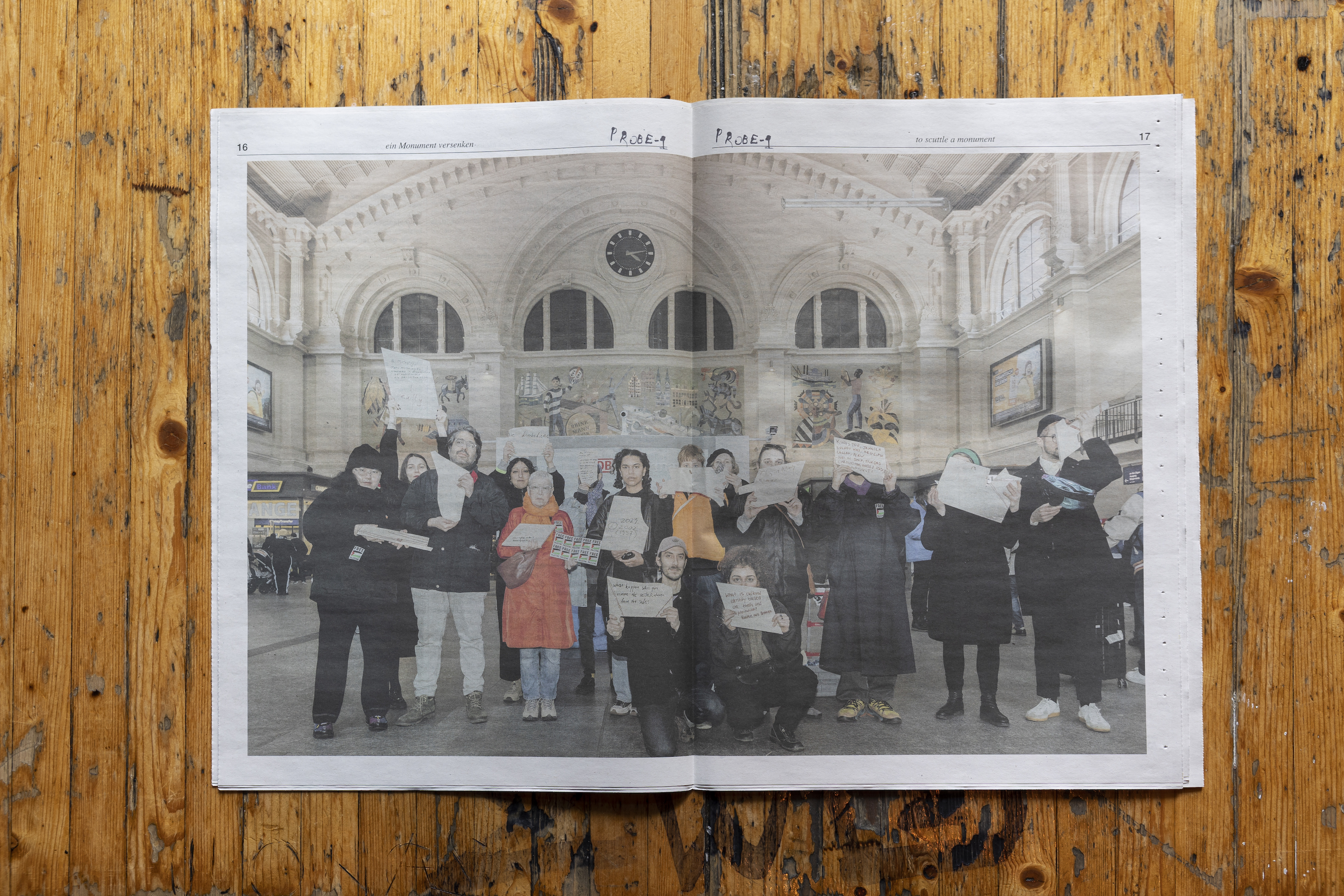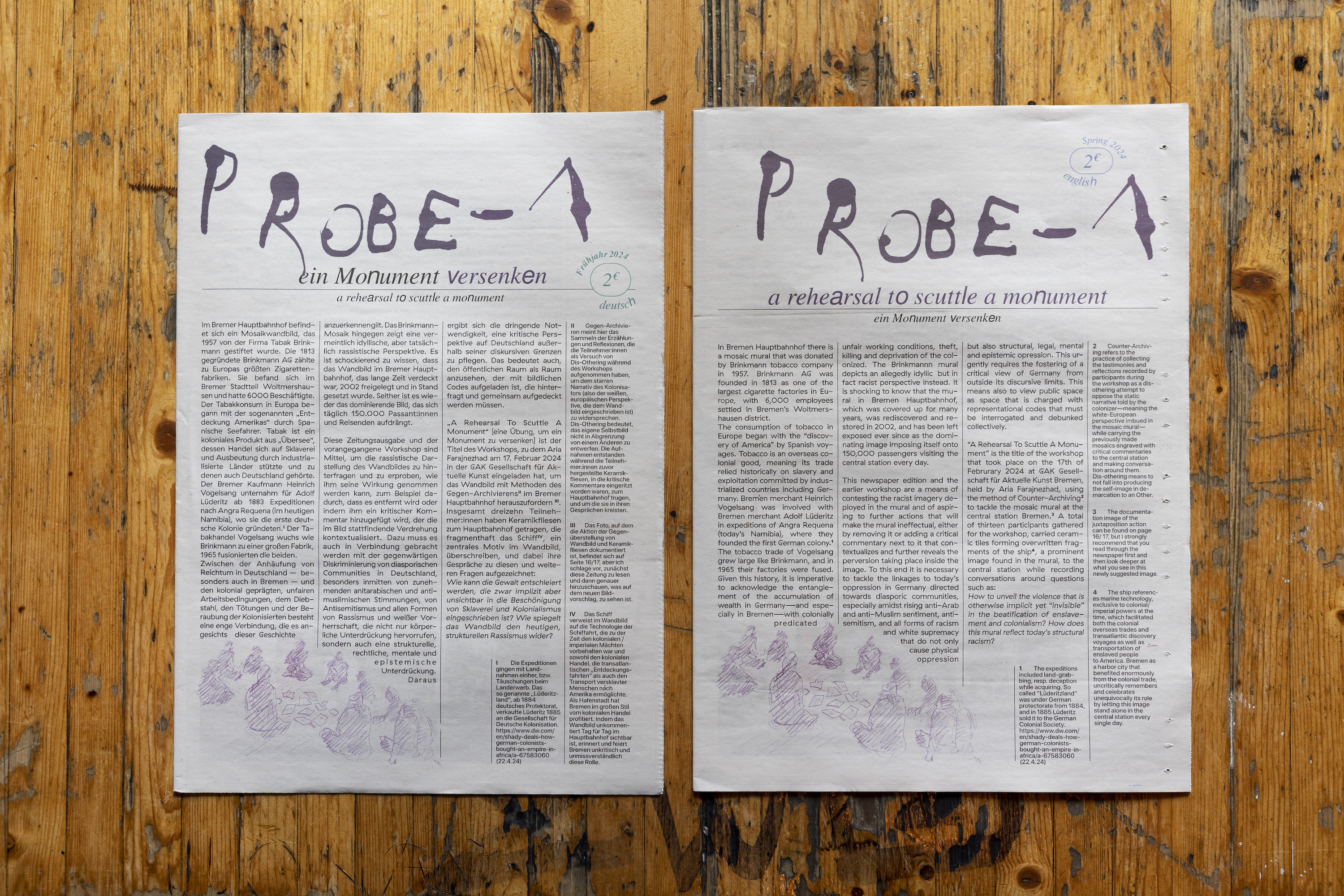 Together with Eghbal Joudi, Farajnezhad created 79 altered mosaic pieces, seven of which were discussed in the workshop “A Rehearsal To Scuttle A Monument” at GAK Bremen on February 17th, 2024. The conversations from this workshop were written down and published in the newspaper “Probe l: ein Monument versenken,” which is also available at the exhibition. Further editions are planed and supposed to be available at kiosks since the newspaper aims to connect critical discussions with the general public, reaching those who might not usually attend art events.