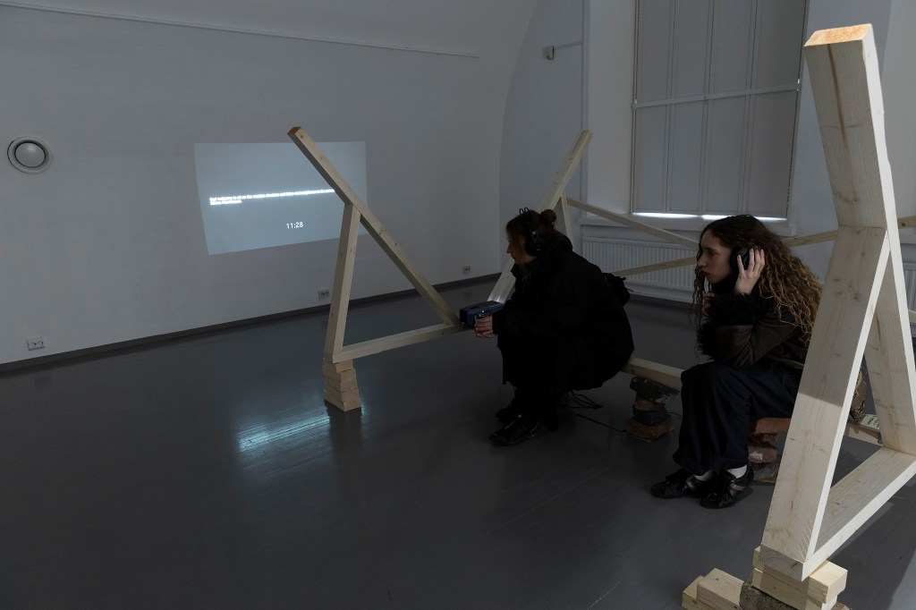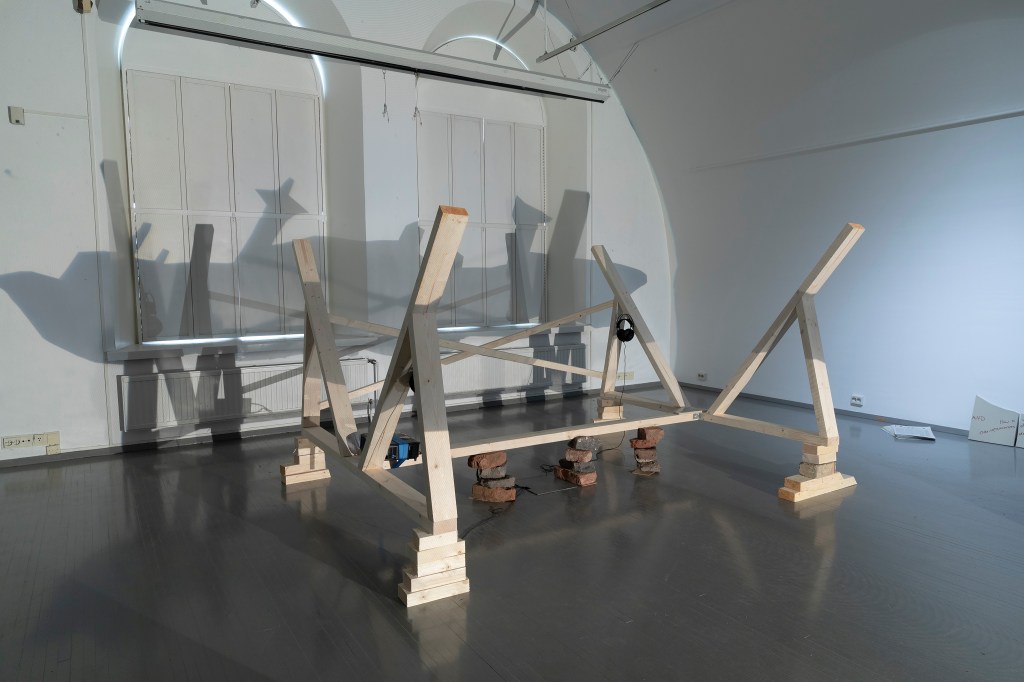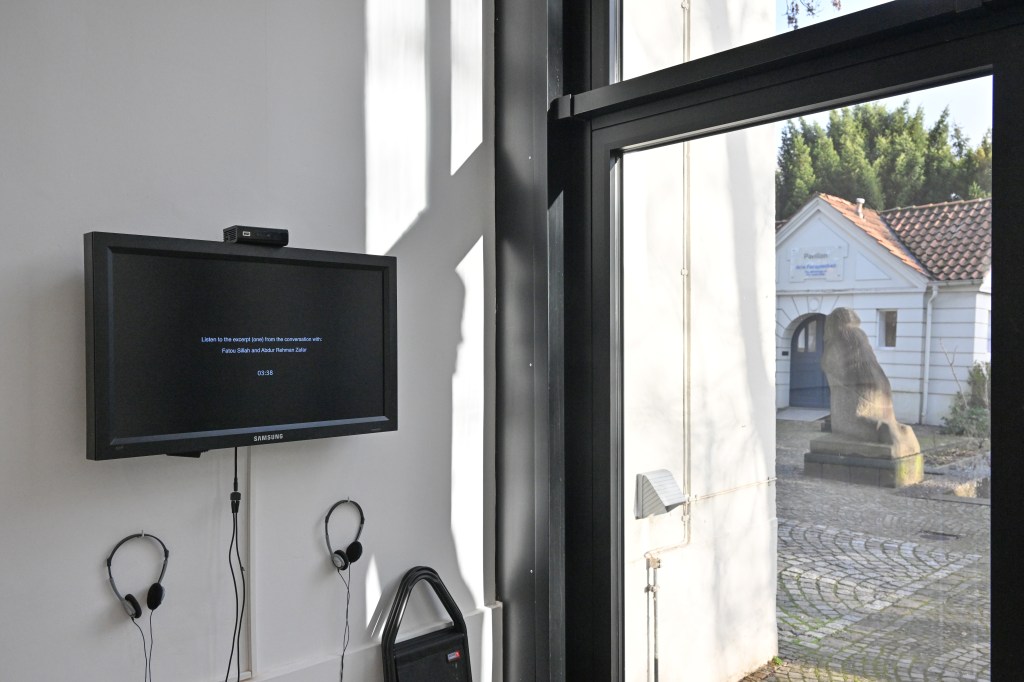 The installation features a wooden structure analogous to a ship stand found at the dry dock near HIAP studios. Visitors were invited to take a sit and listen via headphones to Farajnezhad’s conversation with local interlocutors including Ali Ali and Minna Henriksson, exploring a key question from Sylvia Wynter’s work: how to unsettle the over-representation of Man-As-Human. This installation is part of a larger project examining the colonial imagery embedded in the mural at central station Bremen deploying counter-archiving.
