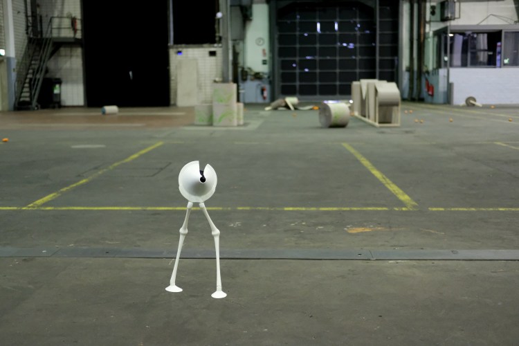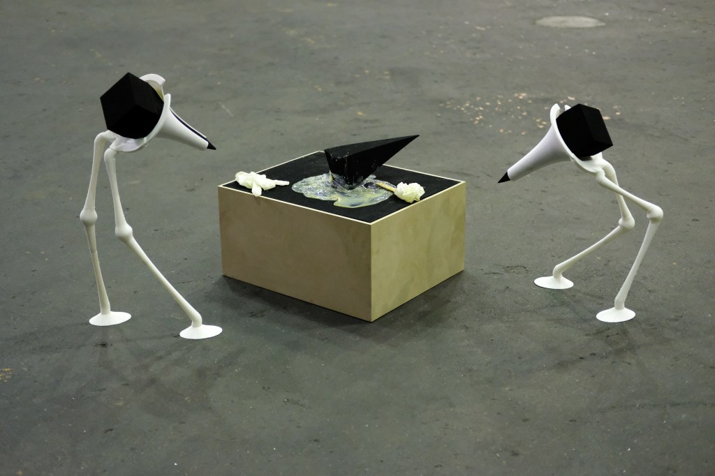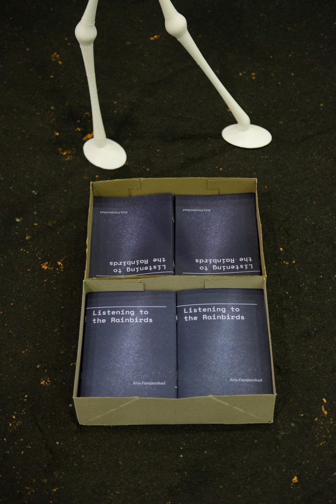 At the center of the installation are sculptural interventions that merge bird anatomy with an enlarged otoscope and pyramidal forms from anechoic chambers. These hybrid figures, alongside six PVC pipes referencing the water suppression system, form a speculative space where technologies of exposure—satellite and otoscope—converge. One makes the earth visible from orbit; the other inspects the ear. Both demand bodily or planetary vulnerability.