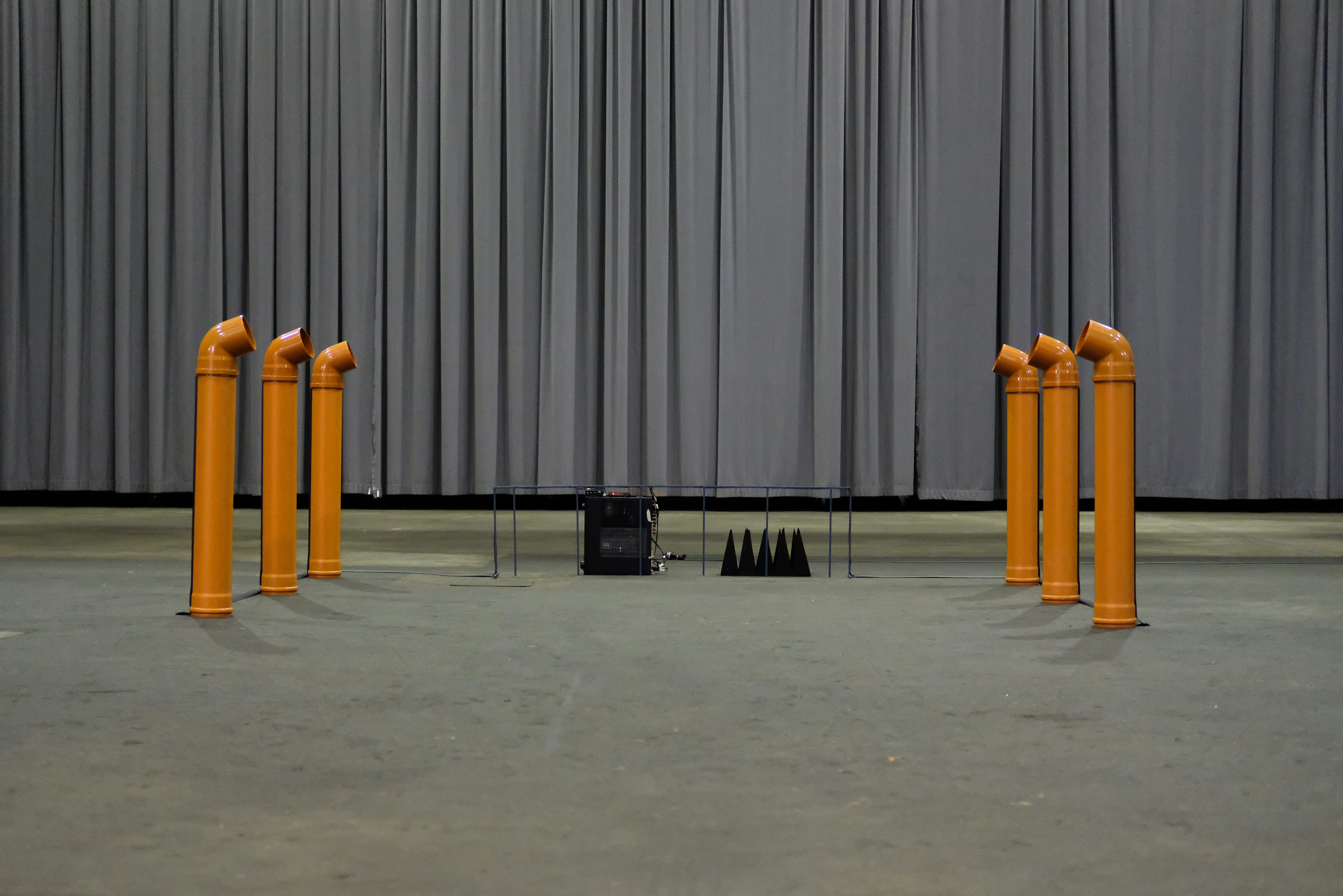 6 channel surround, PVC pipes, water, sound loop, Rf pyramid absorbers, 3d printed sculptures, Wax, metal Fence, disposable gloves