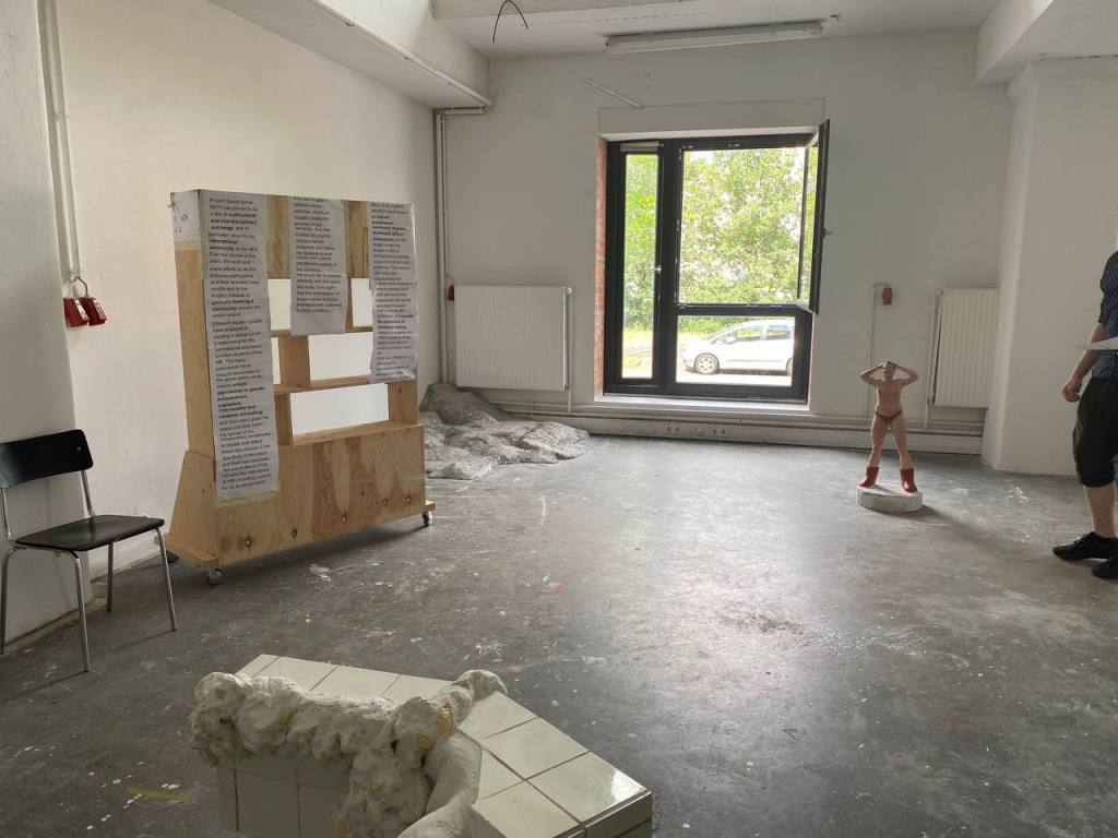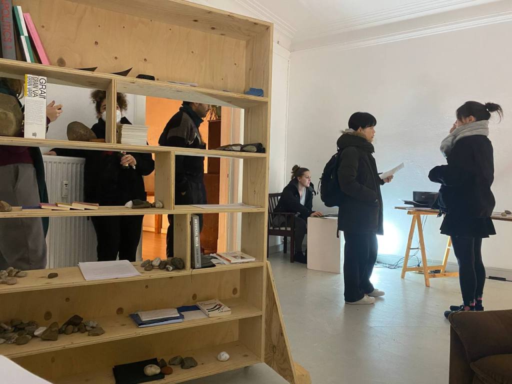 The first intervention, titled Temporary Dislocation As A Response To A Friend, began from a wish to imagine the student-run space as a leading site for critical discourse beyond the Eurocentric academy—borrowing around one hundred chairs from the theory room at HfK Bremen into the project space, shifting the center, even if only temporarily. This wish further took shape through building a bookshelf, which later mutated into the Library for Imagined Futures, initiated by Bubu Mosiashvili and currently run by him and Dorsa Eidizadeh.